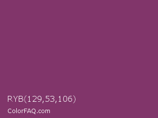 RYB 129,53,106 Color is a normal magenta color and the nearest color is Boysenberry #873260. Hex code #81356a and RGB value is rgb(129,53,106). In RGB color space, this color is composed of 51% red, 21% green, 42% blue, In CMYK color space, this color is composed of 0% cyan, 59% magenta, 18% yellow , 49% black , In HSL color space, this color has a hue angle of 318° , 42% saturation and 36% lightness.