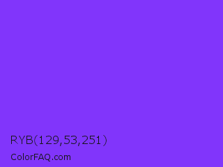 RYB 129,53,251 Color is a normal violet color and the nearest color is Blue Violet #8a2be2. Hex code #8135fb and RGB value is rgb(129,53,251). In RGB color space, this color is composed of 51% red, 21% green, 98% blue, In CMYK color space, this color is composed of 49% cyan, 79% magenta, 0% yellow , 2% black , In HSL color space, this color has a hue angle of 263° , 96% saturation and 60% lightness.