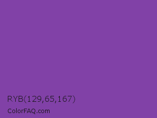 RYB 129,65,167 Color is a normal purple color and the nearest color is Royal Purple #7851a9. Hex code #8141a7 and RGB value is rgb(129,65,167). In RGB color space, this color is composed of 51% red, 25% green, 65% blue, In CMYK color space, this color is composed of 23% cyan, 61% magenta, 0% yellow , 35% black , In HSL color space, this color has a hue angle of 278° , 44% saturation and 45% lightness.