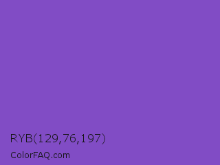 RYB 129,76,197 Color is a normal violet color and the nearest color is Fuchsia Blue #7a58c1. Hex code #814cc5 and RGB value is rgb(129,76,197). In RGB color space, this color is composed of 51% red, 30% green, 77% blue, In CMYK color space, this color is composed of 35% cyan, 61% magenta, 0% yellow , 23% black , In HSL color space, this color has a hue angle of 266° , 51% saturation and 54% lightness.