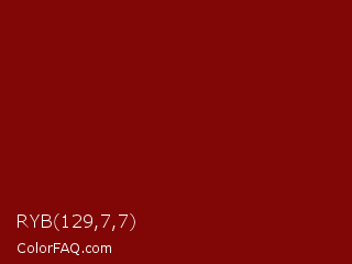 RYB 129,7,7 Color is a dark red color and the nearest color is Barn Red #7c0a02. Hex code #810707 and RGB value is rgb(129,7,7). In RGB color space, this color is composed of 51% red, 3% green, 3% blue, In CMYK color space, this color is composed of 0% cyan, 95% magenta, 95% yellow , 49% black , In HSL color space, this color has a hue angle of 0° , 90% saturation and 27% lightness.