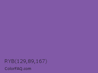 RYB 129,89,167 Color is a normal purple color and the nearest color is Royal Purple #7851a9. Hex code #8159a7 and RGB value is rgb(129,89,167). In RGB color space, this color is composed of 51% red, 35% green, 65% blue, In CMYK color space, this color is composed of 23% cyan, 47% magenta, 0% yellow , 35% black , In HSL color space, this color has a hue angle of 271° , 31% saturation and 50% lightness.