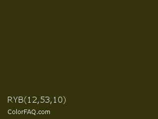 RYB 12,53,10 Color is a very dark yellow color and the nearest color is Waiouru #363c0d. Hex code #35330a and RGB value is rgb(53,51,10). In RGB color space, this color is composed of 21% red, 20% green, 4% blue, In CMYK color space, this color is composed of 0% cyan, 4% magenta, 81% yellow , 79% black , In HSL color space, this color has a hue angle of 57° , 68% saturation and 12% lightness.