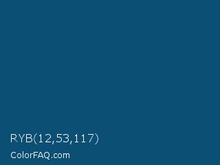 RYB 12,53,117 Color is a dark blue color and the nearest color is Chathams Blue #175579. Hex code #0c4f75 and RGB value is rgb(12,79,117). In RGB color space, this color is composed of 5% red, 31% green, 46% blue, In CMYK color space, this color is composed of 90% cyan, 32% magenta, 0% yellow , 54% black , In HSL color space, this color has a hue angle of 202° , 81% saturation and 25% lightness.