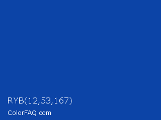 RYB 12,53,167 Color is a normal blue color and the nearest color is Cobalt #0047ab. Hex code #0c44a7 and RGB value is rgb(12,68,167). In RGB color space, this color is composed of 5% red, 27% green, 65% blue, In CMYK color space, this color is composed of 93% cyan, 59% magenta, 0% yellow , 35% black , In HSL color space, this color has a hue angle of 218° , 87% saturation and 35% lightness.