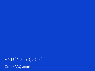 RYB 12,53,207 Color is a normal blue color and the nearest color is Absolute Zero #0048ba. Hex code #0c40cf and RGB value is rgb(12,64,207). In RGB color space, this color is composed of 5% red, 25% green, 81% blue, In CMYK color space, this color is composed of 94% cyan, 69% magenta, 0% yellow , 19% black , In HSL color space, this color has a hue angle of 224° , 89% saturation and 43% lightness.