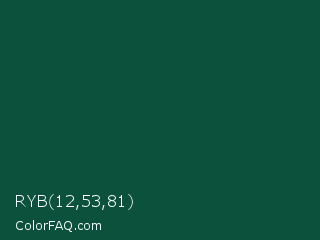 RYB 12,53,81 Color is a very dark green color and the nearest color is Sacramento State Green #00563f. Hex code #0c513b and RGB value is rgb(12,81,59). In RGB color space, this color is composed of 5% red, 32% green, 23% blue, In CMYK color space, this color is composed of 85% cyan, 0% magenta, 27% yellow , 68% black , In HSL color space, this color has a hue angle of 161° , 74% saturation and 18% lightness.