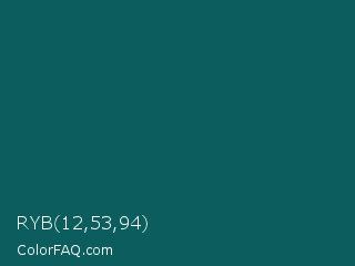 RYB 12,53,94 Color is a very dark cyan color and the nearest color is Deep Sea Green #095859. Hex code #0c5e5e and RGB value is rgb(12,94,94). In RGB color space, this color is composed of 5% red, 37% green, 37% blue, In CMYK color space, this color is composed of 87% cyan, 0% magenta, 0% yellow , 63% black , In HSL color space, this color has a hue angle of 180° , 77% saturation and 21% lightness.