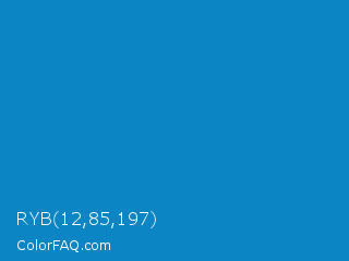 RYB 12,85,197 Color is a normal blue color and the nearest color is Cyan Cornflower Blue #188bc2. Hex code #0c85c5 and RGB value is rgb(12,133,197). In RGB color space, this color is composed of 5% red, 52% green, 77% blue, In CMYK color space, this color is composed of 94% cyan, 32% magenta, 0% yellow , 23% black , In HSL color space, this color has a hue angle of 201° , 89% saturation and 41% lightness.