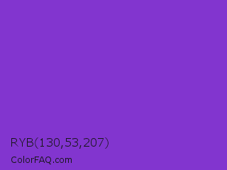 RYB 130,53,207 Color is a normal violet color and the nearest color is Blue Violet #8a2be2. Hex code #8235cf and RGB value is rgb(130,53,207). In RGB color space, this color is composed of 51% red, 21% green, 81% blue, In CMYK color space, this color is composed of 37% cyan, 74% magenta, 0% yellow , 19% black , In HSL color space, this color has a hue angle of 270° , 62% saturation and 51% lightness.