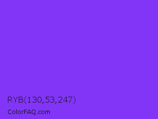 RYB 130,53,247 Color is a normal violet color and the nearest color is Blue Violet #8a2be2. Hex code #8235f7 and RGB value is rgb(130,53,247). In RGB color space, this color is composed of 51% red, 21% green, 97% blue, In CMYK color space, this color is composed of 47% cyan, 79% magenta, 0% yellow , 3% black , In HSL color space, this color has a hue angle of 264° , 92% saturation and 59% lightness.