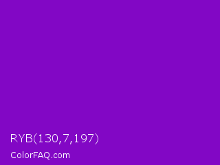 RYB 130,7,197 Color is a normal purple color and the nearest color is French Violet #8806ce. Hex code #8207c5 and RGB value is rgb(130,7,197). In RGB color space, this color is composed of 51% red, 3% green, 77% blue, In CMYK color space, this color is composed of 34% cyan, 96% magenta, 0% yellow , 23% black , In HSL color space, this color has a hue angle of 279° , 93% saturation and 40% lightness.