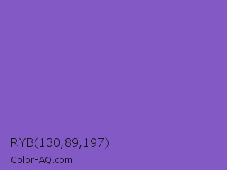 RYB 130,89,197 Color is a normal violet color and the nearest color is Fuchsia Blue #7a58c1. Hex code #8259c5 and RGB value is rgb(130,89,197). In RGB color space, this color is composed of 51% red, 35% green, 77% blue, In CMYK color space, this color is composed of 34% cyan, 55% magenta, 0% yellow , 23% black , In HSL color space, this color has a hue angle of 263° , 48% saturation and 56% lightness.
