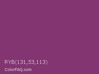 RYB 131,53,113 Color is a normal magenta color and the nearest color is Razzmic Berry Crayola #843179. Hex code #833571 and RGB value is rgb(131,53,113). In RGB color space, this color is composed of 51% red, 21% green, 44% blue, In CMYK color space, this color is composed of 0% cyan, 60% magenta, 14% yellow , 49% black , In HSL color space, this color has a hue angle of 314° , 42% saturation and 36% lightness.