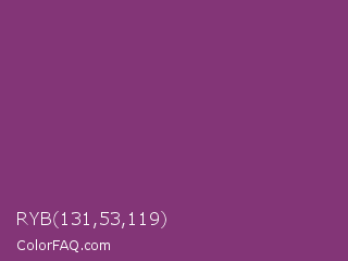 RYB 131,53,119 Color is a normal magenta color and the nearest color is Razzmic Berry Crayola #843179. Hex code #833577 and RGB value is rgb(131,53,119). In RGB color space, this color is composed of 51% red, 21% green, 47% blue, In CMYK color space, this color is composed of 0% cyan, 60% magenta, 9% yellow , 49% black , In HSL color space, this color has a hue angle of 309° , 42% saturation and 36% lightness.