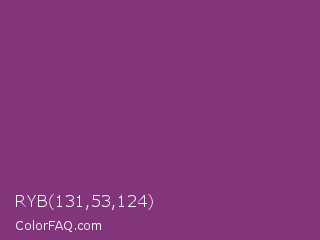 RYB 131,53,124 Color is a normal magenta color and the nearest color is Razzmic Berry Crayola #843179. Hex code #83357c and RGB value is rgb(131,53,124). In RGB color space, this color is composed of 51% red, 21% green, 49% blue, In CMYK color space, this color is composed of 0% cyan, 60% magenta, 5% yellow , 49% black , In HSL color space, this color has a hue angle of 305° , 42% saturation and 36% lightness.