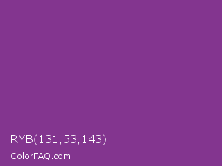 RYB 131,53,143 Color is a normal magenta color and the nearest color is Vivid Violet #803790. Hex code #83358f and RGB value is rgb(131,53,143). In RGB color space, this color is composed of 51% red, 21% green, 56% blue, In CMYK color space, this color is composed of 8% cyan, 63% magenta, 0% yellow , 44% black , In HSL color space, this color has a hue angle of 292° , 46% saturation and 38% lightness.