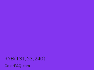 RYB 131,53,240 Color is a normal violet color and the nearest color is Blue Violet #8a2be2. Hex code #8335f0 and RGB value is rgb(131,53,240). In RGB color space, this color is composed of 51% red, 21% green, 94% blue, In CMYK color space, this color is composed of 45% cyan, 78% magenta, 0% yellow , 6% black , In HSL color space, this color has a hue angle of 265° , 86% saturation and 57% lightness.
