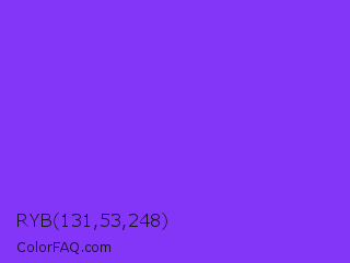 RYB 131,53,248 Color is a normal violet color and the nearest color is Blue Violet #8a2be2. Hex code #8335f8 and RGB value is rgb(131,53,248). In RGB color space, this color is composed of 51% red, 21% green, 97% blue, In CMYK color space, this color is composed of 47% cyan, 79% magenta, 0% yellow , 3% black , In HSL color space, this color has a hue angle of 264° , 93% saturation and 59% lightness.