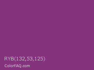 RYB 132,53,125 Color is a normal magenta color and the nearest color is Razzmic Berry Crayola #843179. Hex code #84357d and RGB value is rgb(132,53,125). In RGB color space, this color is composed of 52% red, 21% green, 49% blue, In CMYK color space, this color is composed of 0% cyan, 60% magenta, 5% yellow , 48% black , In HSL color space, this color has a hue angle of 305° , 43% saturation and 36% lightness.