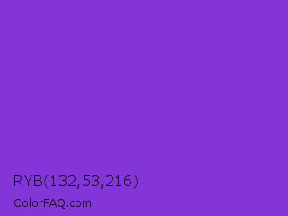 RYB 132,53,216 Color is a normal violet color and the nearest color is Blue Violet #8a2be2. Hex code #8435d8 and RGB value is rgb(132,53,216). In RGB color space, this color is composed of 52% red, 21% green, 85% blue, In CMYK color space, this color is composed of 39% cyan, 75% magenta, 0% yellow , 15% black , In HSL color space, this color has a hue angle of 269° , 68% saturation and 53% lightness.