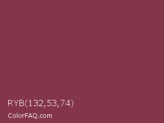 RYB 132,53,74 Color is a normal rose color and the nearest color is Solid Pink #893843. Hex code #84354a and RGB value is rgb(132,53,74). In RGB color space, this color is composed of 52% red, 21% green, 29% blue, In CMYK color space, this color is composed of 0% cyan, 60% magenta, 44% yellow , 48% black , In HSL color space, this color has a hue angle of 344° , 43% saturation and 36% lightness.