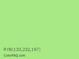 RYB 133,232,197 Color is a light green color and the nearest color is Feijoa #9fdd8c. Hex code #a8e885 and RGB value is rgb(168,232,133). In RGB color space, this color is composed of 66% red, 91% green, 52% blue, In CMYK color space, this color is composed of 28% cyan, 0% magenta, 43% yellow , 9% black , In HSL color space, this color has a hue angle of 99° , 68% saturation and 72% lightness.