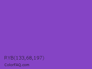 RYB 133,68,197 Color is a normal violet color and the nearest color is Fuchsia Blue #7a58c1. Hex code #8544c5 and RGB value is rgb(133,68,197). In RGB color space, this color is composed of 52% red, 27% green, 77% blue, In CMYK color space, this color is composed of 32% cyan, 65% magenta, 0% yellow , 23% black , In HSL color space, this color has a hue angle of 270° , 53% saturation and 52% lightness.