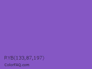 RYB 133,87,197 Color is a normal violet color and the nearest color is Fuchsia Blue #7a58c1. Hex code #8557c5 and RGB value is rgb(133,87,197). In RGB color space, this color is composed of 52% red, 34% green, 77% blue, In CMYK color space, this color is composed of 32% cyan, 56% magenta, 0% yellow , 23% black , In HSL color space, this color has a hue angle of 265° , 49% saturation and 56% lightness.
