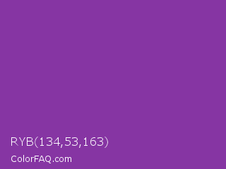 RYB 134,53,163 Color is a normal purple color and the nearest color is Vivid Violet #803790. Hex code #8635a3 and RGB value is rgb(134,53,163). In RGB color space, this color is composed of 53% red, 21% green, 64% blue, In CMYK color space, this color is composed of 18% cyan, 67% magenta, 0% yellow , 36% black , In HSL color space, this color has a hue angle of 284° , 51% saturation and 42% lightness.