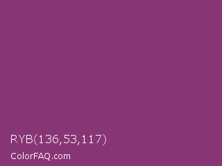 RYB 136,53,117 Color is a normal magenta color and the nearest color is Razzmic Berry Crayola #843179. Hex code #883575 and RGB value is rgb(136,53,117). In RGB color space, this color is composed of 53% red, 21% green, 46% blue, In CMYK color space, this color is composed of 0% cyan, 61% magenta, 14% yellow , 47% black , In HSL color space, this color has a hue angle of 314° , 44% saturation and 37% lightness.