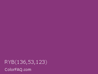 RYB 136,53,123 Color is a normal magenta color and the nearest color is Razzmic Berry Crayola #843179. Hex code #88357b and RGB value is rgb(136,53,123). In RGB color space, this color is composed of 53% red, 21% green, 48% blue, In CMYK color space, this color is composed of 0% cyan, 61% magenta, 10% yellow , 47% black , In HSL color space, this color has a hue angle of 309° , 44% saturation and 37% lightness.