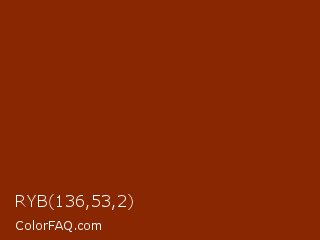 RYB 136,53,2 Color is a dark orange color and the nearest color is Smokey Topaz #832a0d. Hex code #882702 and RGB value is rgb(136,39,2). In RGB color space, this color is composed of 53% red, 15% green, 1% blue, In CMYK color space, this color is composed of 0% cyan, 71% magenta, 99% yellow , 47% black , In HSL color space, this color has a hue angle of 17° , 97% saturation and 27% lightness.