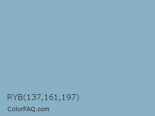 RYB 137,161,197 Color is a light blue color and the nearest color is Nepal #8eabc1. Hex code #89b1c5 and RGB value is rgb(137,177,197). In RGB color space, this color is composed of 54% red, 69% green, 77% blue, In CMYK color space, this color is composed of 30% cyan, 10% magenta, 0% yellow , 23% black , In HSL color space, this color has a hue angle of 200° , 34% saturation and 65% lightness.