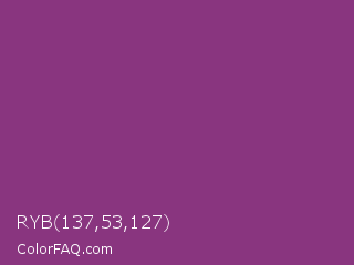RYB 137,53,127 Color is a normal magenta color and the nearest color is Razzmic Berry Crayola #843179. Hex code #89357f and RGB value is rgb(137,53,127). In RGB color space, this color is composed of 54% red, 21% green, 50% blue, In CMYK color space, this color is composed of 0% cyan, 61% magenta, 7% yellow , 46% black , In HSL color space, this color has a hue angle of 307° , 44% saturation and 37% lightness.