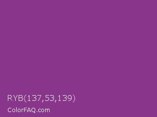 RYB 137,53,139 Color is a normal magenta color and the nearest color is Vivid Violet #803790. Hex code #89358b and RGB value is rgb(137,53,139). In RGB color space, this color is composed of 54% red, 21% green, 55% blue, In CMYK color space, this color is composed of 1% cyan, 62% magenta, 0% yellow , 45% black , In HSL color space, this color has a hue angle of 299° , 45% saturation and 38% lightness.
