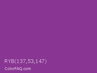 RYB 137,53,147 Color is a normal magenta color and the nearest color is Vivid Violet #803790. Hex code #893593 and RGB value is rgb(137,53,147). In RGB color space, this color is composed of 54% red, 21% green, 58% blue, In CMYK color space, this color is composed of 7% cyan, 64% magenta, 0% yellow , 42% black , In HSL color space, this color has a hue angle of 294° , 47% saturation and 39% lightness.