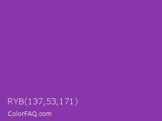 RYB 137,53,171 Color is a normal purple color and the nearest color is Grape #6f2da8. Hex code #8935ab and RGB value is rgb(137,53,171). In RGB color space, this color is composed of 54% red, 21% green, 67% blue, In CMYK color space, this color is composed of 20% cyan, 69% magenta, 0% yellow , 33% black , In HSL color space, this color has a hue angle of 283° , 53% saturation and 44% lightness.