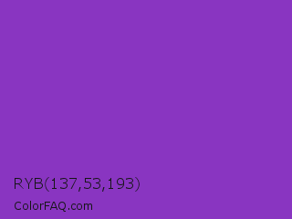 RYB 137,53,193 Color is a normal purple color and the nearest color is Dark Orchid #9932cc. Hex code #8935c1 and RGB value is rgb(137,53,193). In RGB color space, this color is composed of 54% red, 21% green, 76% blue, In CMYK color space, this color is composed of 29% cyan, 73% magenta, 0% yellow , 24% black , In HSL color space, this color has a hue angle of 276° , 57% saturation and 48% lightness.