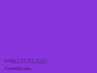 RYB 137,53,222 Color is a normal violet color and the nearest color is Blue Violet #8a2be2. Hex code #8935de and RGB value is rgb(137,53,222). In RGB color space, this color is composed of 54% red, 21% green, 87% blue, In CMYK color space, this color is composed of 38% cyan, 76% magenta, 0% yellow , 13% black , In HSL color space, this color has a hue angle of 270° , 72% saturation and 54% lightness.