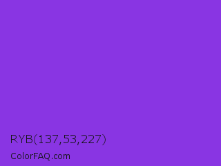 RYB 137,53,227 Color is a normal violet color and the nearest color is Blue Violet #8a2be2. Hex code #8935e3 and RGB value is rgb(137,53,227). In RGB color space, this color is composed of 54% red, 21% green, 89% blue, In CMYK color space, this color is composed of 40% cyan, 77% magenta, 0% yellow , 11% black , In HSL color space, this color has a hue angle of 269° , 76% saturation and 55% lightness.