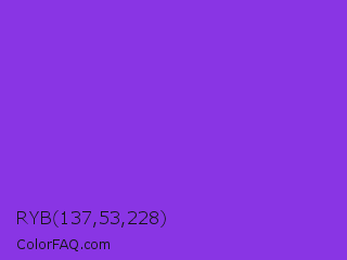 RYB 137,53,228 Color is a normal violet color and the nearest color is Blue Violet #8a2be2. Hex code #8935e4 and RGB value is rgb(137,53,228). In RGB color space, this color is composed of 54% red, 21% green, 89% blue, In CMYK color space, this color is composed of 40% cyan, 77% magenta, 0% yellow , 11% black , In HSL color space, this color has a hue angle of 269° , 76% saturation and 55% lightness.