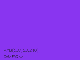 RYB 137,53,240 Color is a normal violet color and the nearest color is Blue Violet #8a2be2. Hex code #8935f0 and RGB value is rgb(137,53,240). In RGB color space, this color is composed of 54% red, 21% green, 94% blue, In CMYK color space, this color is composed of 43% cyan, 78% magenta, 0% yellow , 6% black , In HSL color space, this color has a hue angle of 267° , 86% saturation and 57% lightness.