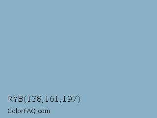 RYB 138,161,197 Color is a light blue color and the nearest color is Nepal #8eabc1. Hex code #8ab0c5 and RGB value is rgb(138,176,197). In RGB color space, this color is composed of 54% red, 69% green, 77% blue, In CMYK color space, this color is composed of 30% cyan, 11% magenta, 0% yellow , 23% black , In HSL color space, this color has a hue angle of 201° , 34% saturation and 66% lightness.