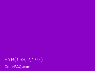 RYB 138,2,197 Color is a normal purple color and the nearest color is French Violet #8806ce. Hex code #8a02c5 and RGB value is rgb(138,2,197). In RGB color space, this color is composed of 54% red, 1% green, 77% blue, In CMYK color space, this color is composed of 30% cyan, 99% magenta, 0% yellow , 23% black , In HSL color space, this color has a hue angle of 282° , 98% saturation and 39% lightness.