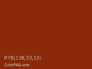 RYB 138,53,10 Color is a dark color and the nearest color is Smokey Topaz #832a0d. Hex code #8a2a0a and RGB value is rgb(138,42,10). In RGB color space, this color is composed of 54% red, 16% green, 4% blue, In CMYK color space, this color is composed of 0% cyan, 70% magenta, 93% yellow , 46% black , In HSL color space, this color has a hue angle of 15° , 86% saturation and 29% lightness.