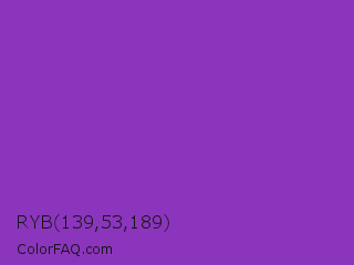 RYB 139,53,189 Color is a normal purple color and the nearest color is Dark Orchid #9932cc. Hex code #8b35bd and RGB value is rgb(139,53,189). In RGB color space, this color is composed of 55% red, 21% green, 74% blue, In CMYK color space, this color is composed of 26% cyan, 72% magenta, 0% yellow , 26% black , In HSL color space, this color has a hue angle of 278° , 56% saturation and 47% lightness.