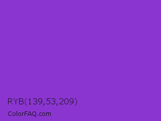 RYB 139,53,209 Color is a normal purple color and the nearest color is Dark Orchid #9932cc. Hex code #8b35d1 and RGB value is rgb(139,53,209). In RGB color space, this color is composed of 55% red, 21% green, 82% blue, In CMYK color space, this color is composed of 33% cyan, 75% magenta, 0% yellow , 18% black , In HSL color space, this color has a hue angle of 273° , 63% saturation and 51% lightness.