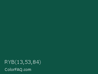 RYB 13,53,84 Color is a very dark cyan color and the nearest color is Evening Sea #024e46. Hex code #0d5444 and RGB value is rgb(13,84,68). In RGB color space, this color is composed of 5% red, 33% green, 27% blue, In CMYK color space, this color is composed of 85% cyan, 0% magenta, 19% yellow , 67% black , In HSL color space, this color has a hue angle of 166° , 73% saturation and 19% lightness.