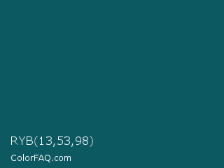 RYB 13,53,98 Color is a very dark cyan color and the nearest color is Deep Sea Green #095859. Hex code #0d5962 and RGB value is rgb(13,89,98). In RGB color space, this color is composed of 5% red, 35% green, 38% blue, In CMYK color space, this color is composed of 87% cyan, 9% magenta, 0% yellow , 62% black , In HSL color space, this color has a hue angle of 186° , 77% saturation and 22% lightness.
